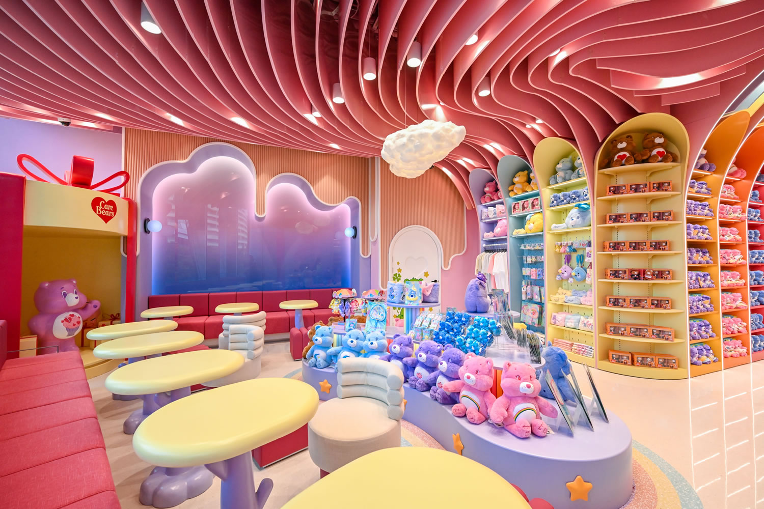 Care Bears主題咖啡店位于cdf三亞國際免稅城C區(qū)二層,以“治愈系空間”為核心設(shè)計理念,整體裝修風格延續(xù)了品牌標志性的彩色風格與柔和線條,店內(nèi)墻面裝飾經(jīng)典小熊插畫,展陳小熊玩偶,并將IP元素深度融入飲品和甜品設(shè)計。