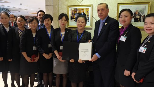 9月5日下午,土耳其總統(tǒng)埃爾多安離開酒店前,對杭州維景的服務(wù)深表滿意,在衆(zhòng)多媒體的關(guān)注下,爲(wèi)杭州維景簽名留念,幷與管理人員合影,感謝杭州維景提供的溫馨、細緻、周到的服務(wù),同時盛情邀請酒店員工去土耳其觀光遊覽。