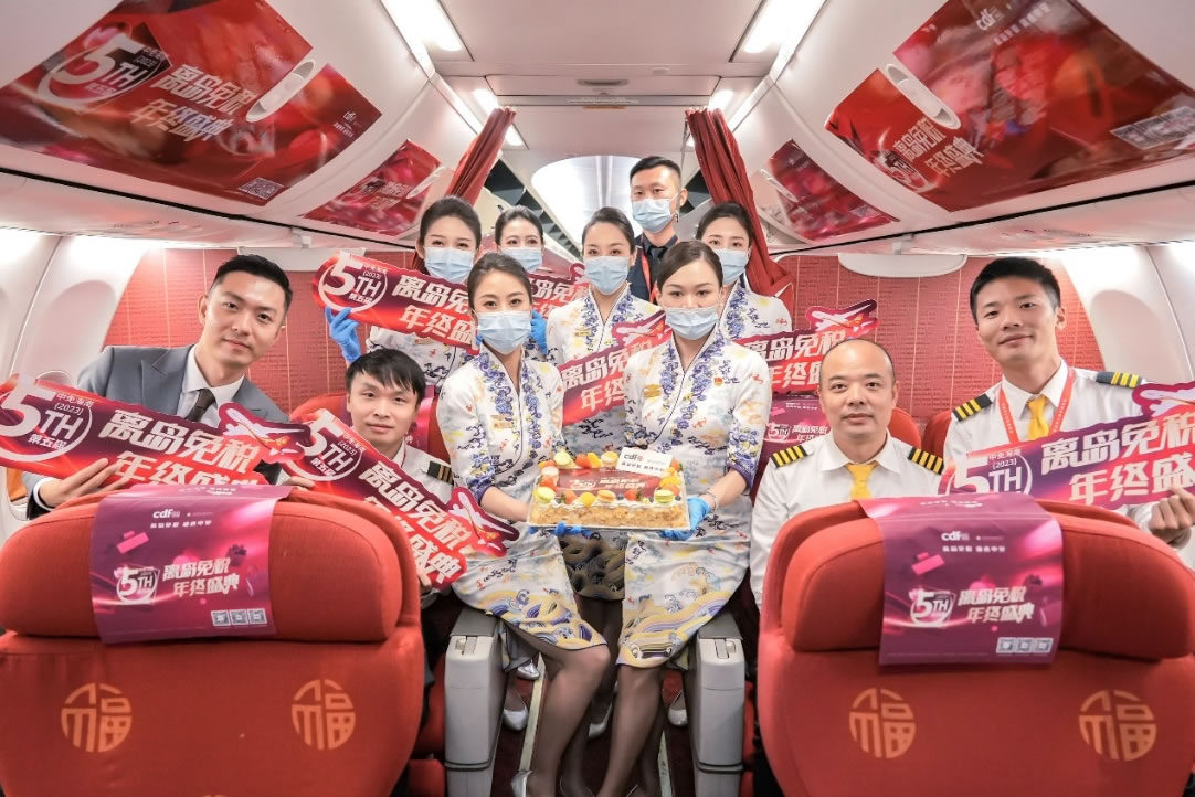 中免集團(tuán)聯(lián)動航空資源推出主題航班活動,帶來了沉浸式的新鮮有趣互動體驗(yàn)。11月15日,cdf海口國際免稅城聯(lián)合cdf??谌赵聫V場免稅店、cdf??诿捞m機(jī)場免稅店,聯(lián)動海南航空,于HU7782北京-??诤桨嗌祥_展主題航班活動,通過營造節(jié)慶氛圍,開展互動問答等趣味活動,與機(jī)上旅客積極互動,并予以乘坐該航班旅客相應(yīng)購物權(quán)益。cdf三亞國際免稅城也在HO1747南京—三亞的吉祥航空主題航班上為乘客精心準(zhǔn)備了主題蛋糕及消費(fèi)權(quán)益,在豐富乘機(jī)體驗(yàn)的同時,更增強(qiáng)旅客對于免稅及活動的了解。